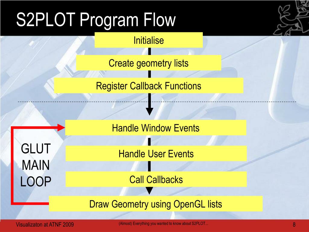 Initialise Create geometry lists Register Callback Functions S2PLOT Program Flow Handle Window Events GLUTMAINLOOP Handle User Events Call Callbacks Draw Geometry using OpenGL lists