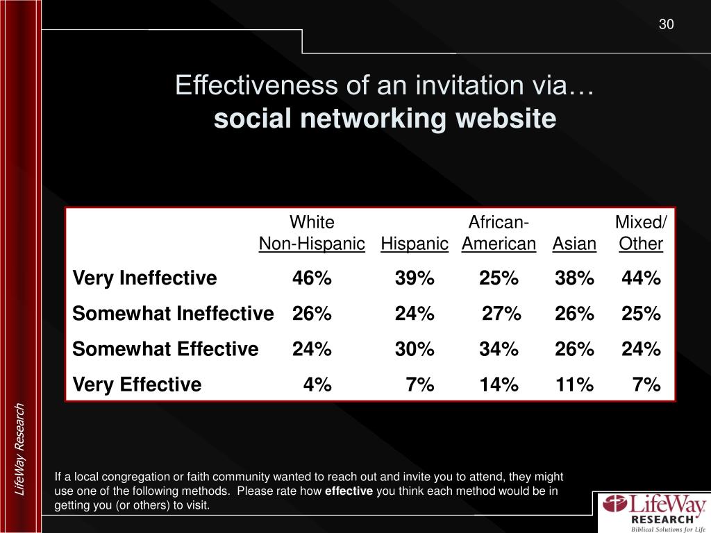 Effectiveness of an invitation via… social networking website White African- Mixed/Non-HispanicHispanicAmericanAsianOther Very Ineffective 46% 39% 25% 38% 44% Somewhat Ineffective 26% 24% 27% 26% 25% Somewhat Effective 24% 30% 34% 26% 24% Very Effective 4% 7% 14% 11% 7% If a local congregation or faith community wanted to reach out and invite you to attend, they might use one of the following methods. Please rate how effective you think each method would be in getting you (or others) to visit.