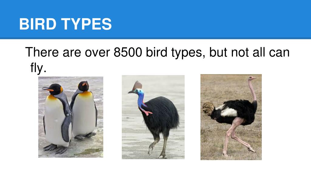 BIRD TYPES There are over 8500 bird types, but not all can fly.