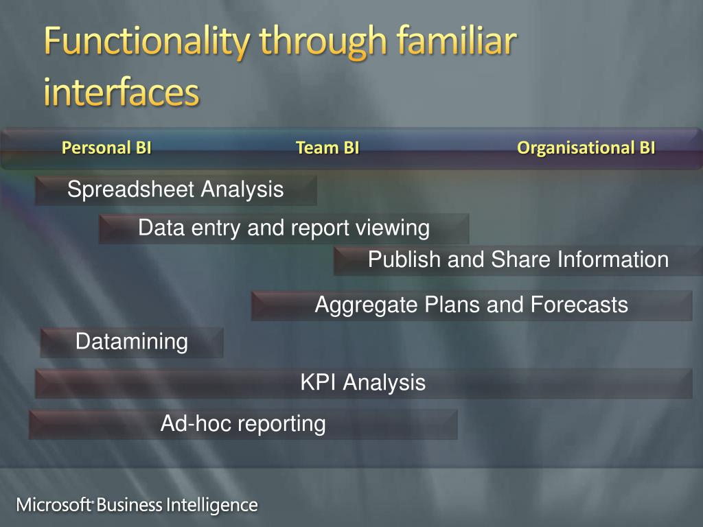 Functionality through familiar interfaces Personal BI Team BI Organisational BI Spreadsheet Analysis Data entry and report viewing Publish and Share Information Aggregate Plans and Forecasts Datamining KPI Analysis Ad-hoc reporting