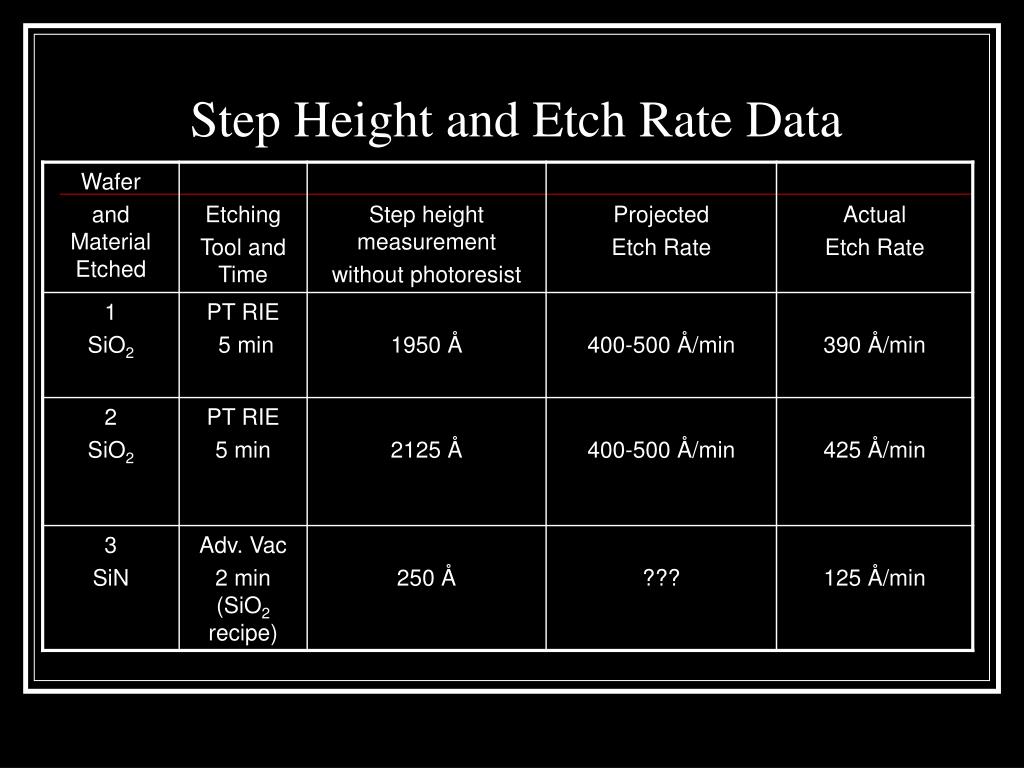 Research Procedure for Verifying Etch Rates of Standard SiO2 and SiN Recipes • 10 minute cleaning process of each etching tool prior to use. • 1 minute seasoning of standard recipe on a “miscellaneous wafer” to create the desired environment in the chamber. • Place the wafer in the center of the chamber for the Adv. Vac or the front right position of the PT RIE (for consistency purposes only), and run the standard etching recipe for the specified time using the appropriate etching tool. • Obtain a post-etch profile of each wafer using P15 Profilometer or the Alpha Step 500 after stripping the sample of its photoresist using 1165 Removerand use the data obtained to determine the etch rate for each process.