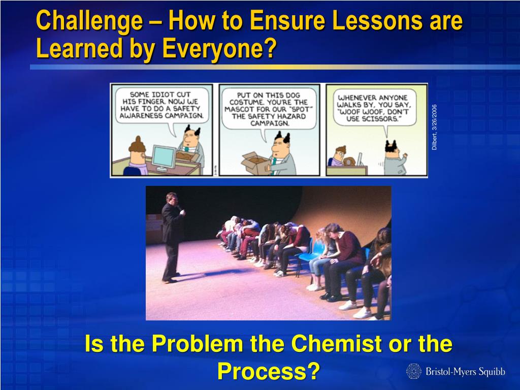 Challenge – How to Ensure Lessons are Learned by Everyone? Dilbert, 3/26/2006 Is the Problem the Chemist or the Process?