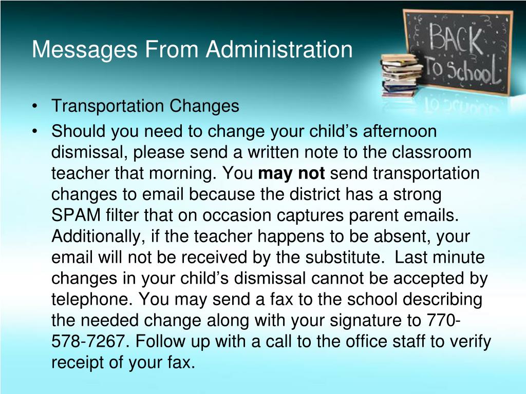 Messages From Administration • Transportation Changes • Should you need to change your child’s afternoon dismissal, please send a written note to the classroom teacher that morning. You may not send transportation changes to email because the district has a strong SPAM filter that on occasion captures parent emails. Additionally, if the teacher happens to be absent, your email will not be received by the substitute. Last minute changes in your child’s dismissal cannot be accepted by telephone. You may send a fax to the school describing the needed change along with your signature to 770-578-7267. Follow up with a call to the office staff to verify receipt of your fax.