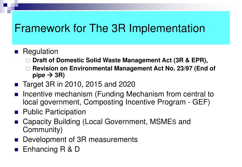 National Policies to Implement the 3R • Vision and Strategies • Vision • Promoting the 3R initiative for enhancing MSW & Industrial Solid Waste Management • Strategies • Awareness Campaign, Education and Participation • Promoting and Embracing Sectors and Local Governments • Incentive approach: Award, Rating, Financial • Capacity Building : SMES and Local Government • R&D • Law & Regulation Development