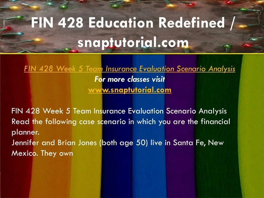 FIN 428 Education Redefined / snaptutorial.com FIN 428 Week 5 Team Insurance Evaluation Scenario Analysis For more classes visit www.snaptutorial.com FIN 428 Week 5 Team Insurance Evaluation Scenario Analysis Read the following case scenario in which you are the financial planner. Jennifer and Brian Jones (both age 50) live in Santa Fe, New Mexico. They own