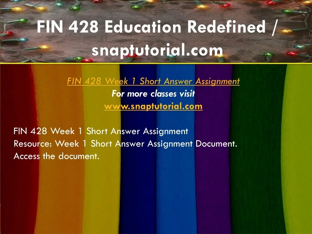 FIN 428 Education Redefined / snaptutorial.com FIN 428 Week 1 Short Answer Assignment For more classes visit www.snaptutorial.com FIN 428 Week 1 Short Answer Assignment Resource: Week 1 Short Answer Assignment Document. Access the document.