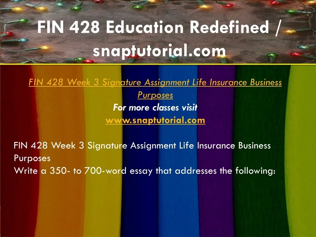 FIN 428 Education Redefined / snaptutorial.com FIN 428 Week 3 Signature Assignment Life Insurance Business Purposes For more classes visit www.snaptutorial.com FIN 428 Week 3 Signature Assignment Life Insurance Business Purposes Write a 350- to 700-word essay that addresses the following: