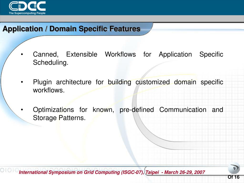 Application / Domain Specific Features • Canned, Extensible Workflows for Application Specific Scheduling. • Plugin architecture for building customized domain specific workflows. • Optimizations for known, pre-defined Communication and Storage Patterns.