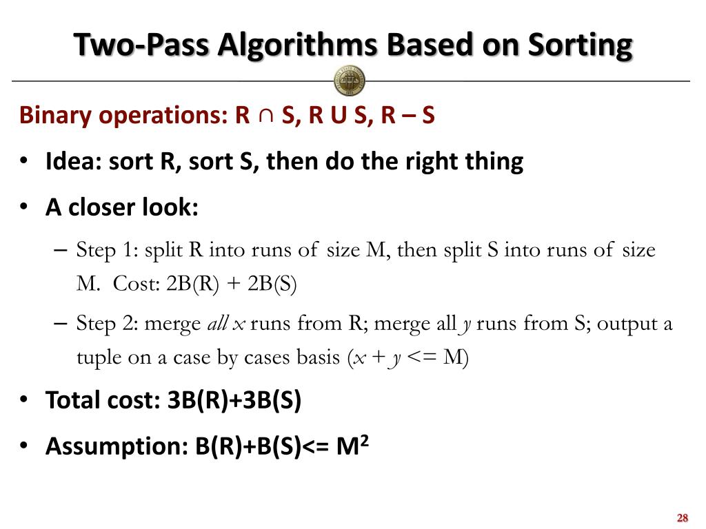 Two-Pass Algorithms Based on Sorting Binary operations: R ∩ S, R U S, R – S • Idea: sort R, sort S, then do the right thing • A closer look: • Step 1: split R into runs of size M, then split S into runs of size M. Cost: 2B(R) + 2B(S) • Step 2: merge all x runs from R; merge all y runs from S; output a tuple on a case by cases basis (x + y <= M) • Total cost: 3B(R)+3B(S) • Assumption: B(R)+B(S)<= M2