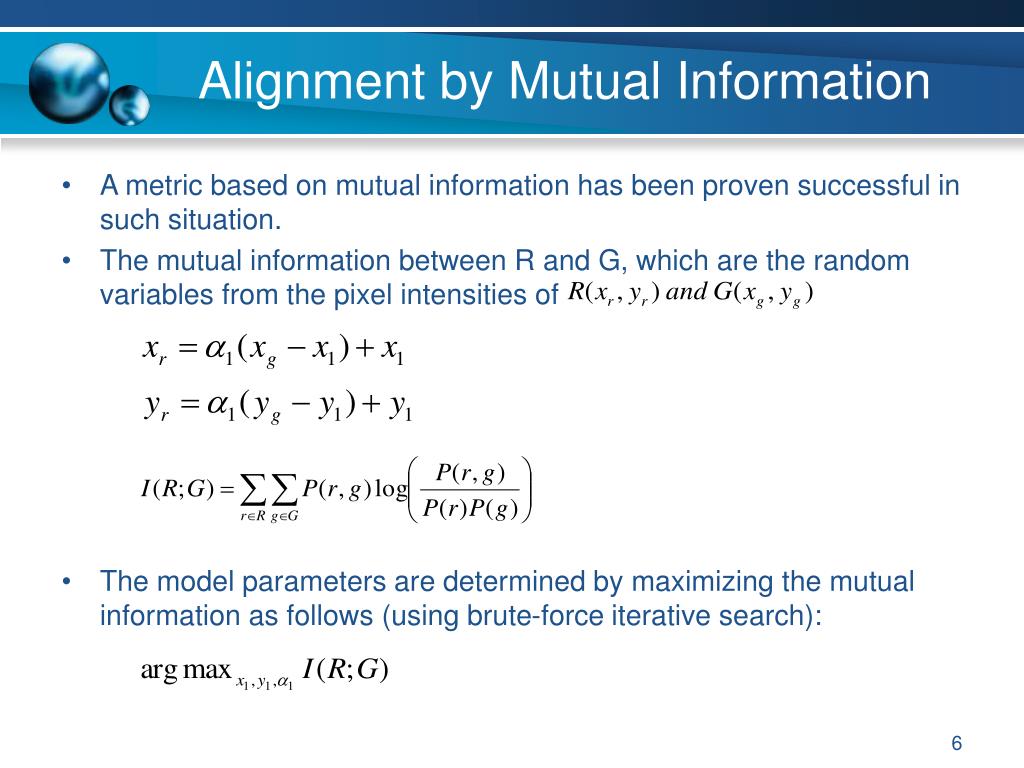 Alignment by Mutual Information • A metric based on mutual information has been proven successful in such situation. • The mutual information between R and G, which are the random variables from the pixel intensities of • The model parameters are determined by maximizing the mutual information as follows (using brute-force iterative search):