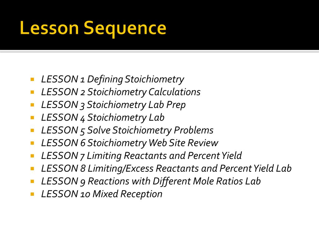 Lesson Sequence • LESSON 1 Defining Stoichiometry • LESSON 2 Stoichiometry Calculations • LESSON 3 Stoichiometry Lab Prep • LESSON 4 Stoichiometry Lab • LESSON 5 Solve Stoichiometry Problems • LESSON 6 Stoichiometry Web Site Review • LESSON 7 Limiting Reactants and Percent Yield • LESSON 8 Limiting/Excess Reactants and Percent Yield Lab • LESSON 9 Reactions with Different Mole Ratios Lab • LESSON 10 Mixed Reception
