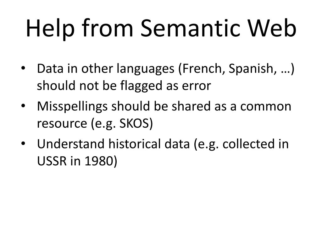 Help from Semantic Web • Data in other languages (French, Spanish, …)should not be flaggedas error • Misspellings should be shared as a common resource (e.g. SKOS) • Understand historical data (e.g. collected in USSR in 1980)