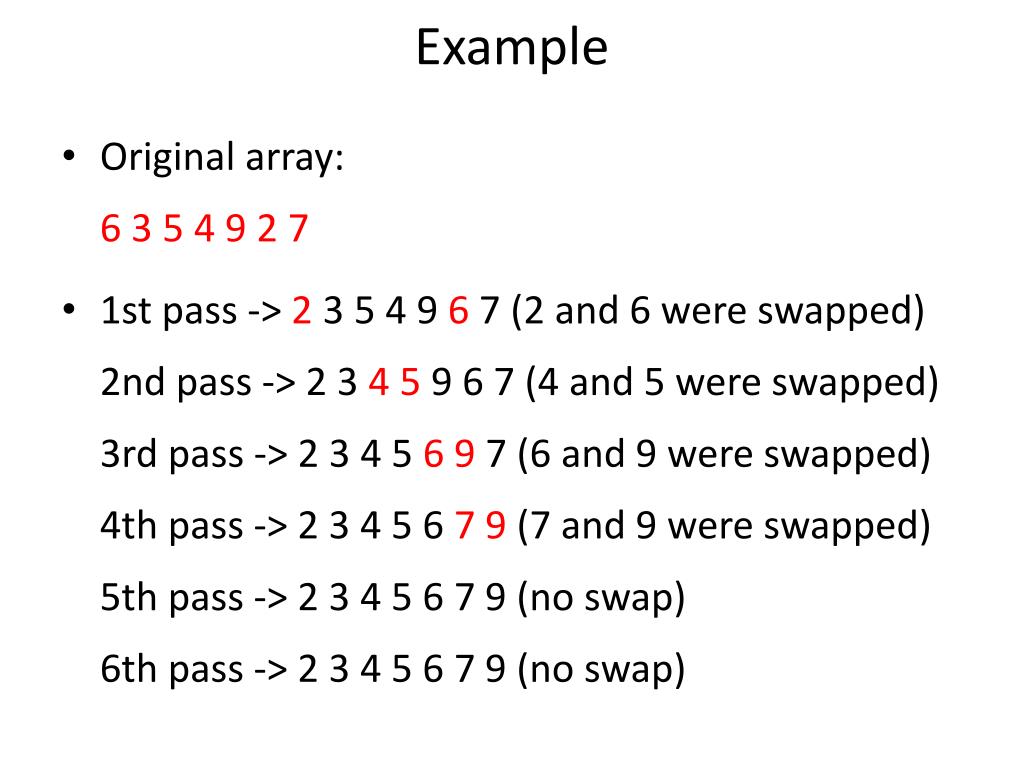 Example • Original array:6 3 5 4 9 2 7 • 1st pass -> 2 3 5 4 9 6 7 (2 and 6 were swapped)2nd pass -> 2 3 4 5 9 6 7 (4 and 5 were swapped)3rd pass -> 2 3 4 5 6 9 7 (6 and 9 were swapped)4th pass -> 2 3 4 5 6 7 9 (7 and 9 were swapped)5th pass -> 2 3 4 5 6 7 9 (no swap)6th pass -> 2 3 4 5 6 7 9 (no swap)