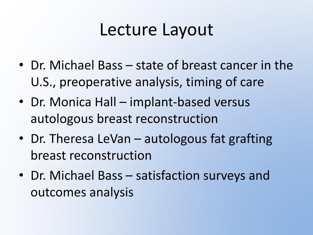 Lecture Layout • Dr. Michael Bass – state of breast cancer in the U.S., preoperative analysis, timing of care • Dr. Monica Hall – implant-based versus autologous breast reconstruction • Dr. Theresa LeVan – autologous fat grafting breast reconstruction • Dr. Michael Bass – satisfaction surveys and outcomes analysis