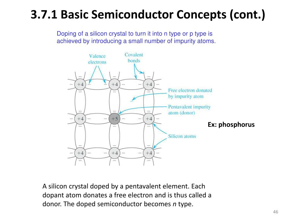 3.7.1 Basic Semiconductor Concepts (cont.) Ex: phosphorus A silicon crystal doped by a pentavalent element. Each dopant atom donates a free electron and is thus called a donor. The doped semiconductor becomes n type.
