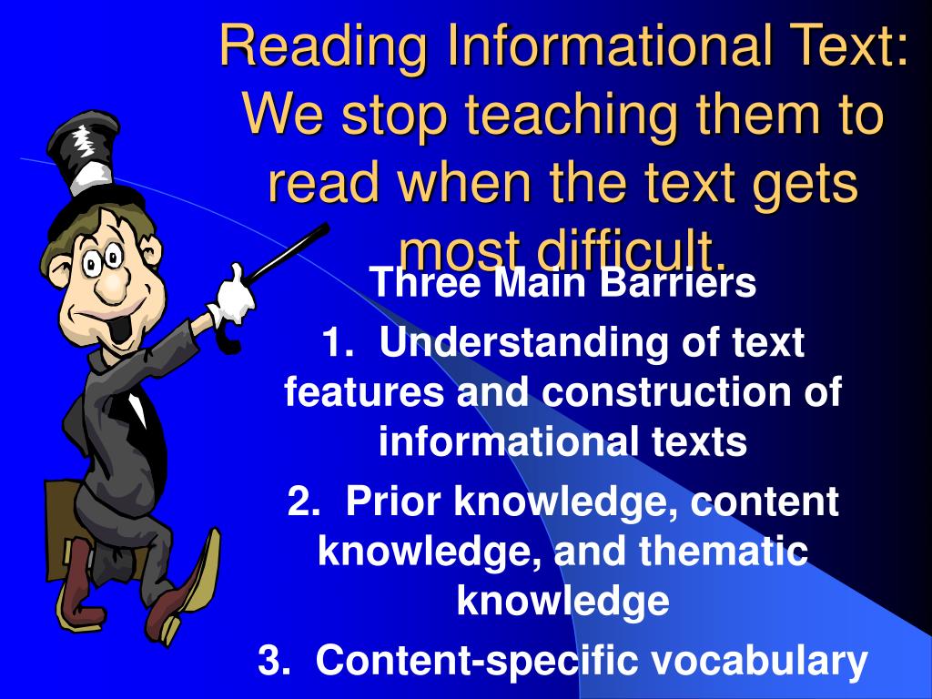 Reading Informational Text: We stop teaching them to read when the text gets most difficult. Three Main Barriers 1. Understanding of text features and construction of informational texts 2. Prior knowledge, content knowledge, and thematic knowledge 3. Content-specific vocabulary