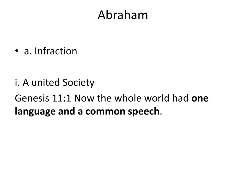 Abraham • a. Infraction i. A united Society Genesis 11:1 Now the whole world had one language and a common speech.