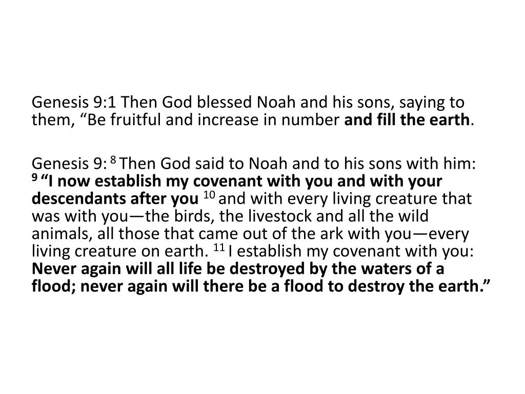 Genesis 9:1 Then God blessed Noah and his sons, saying to them, “Be fruitful and increase in number and fill the earth. Genesis 9:8 Then God said to Noah and to his sons with him: 9 “I now establish my covenant with you and with your descendants after you10 and with every living creature that was with you—the birds, the livestock and all the wild animals, all those that came out of the ark with you—every living creature on earth. 11 I establish my covenant with you: Never again will all life be destroyed by the waters of a flood; never again will there be a flood to destroy the earth.”