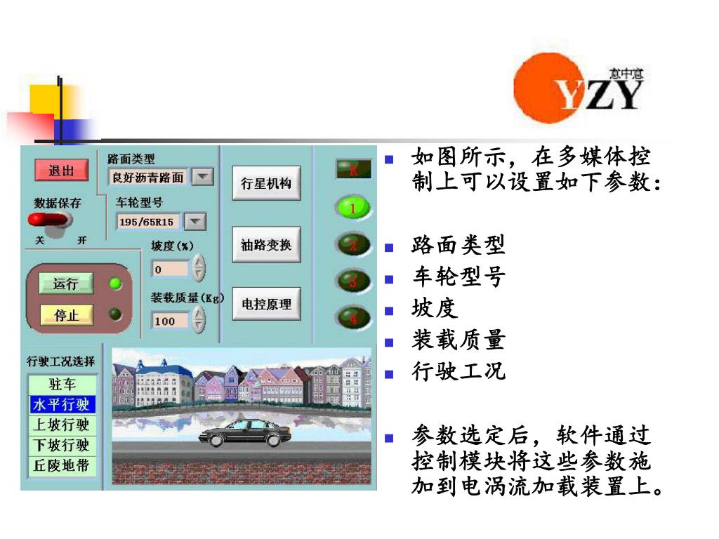 如图所示,在多媒体控制上可以设置如下参数:如图所示,在多媒体控制上可以设置如下参数: 路面类型 车轮型号 坡度 装载质量 行驶工况 参数选定后,软件通过控制模块将这些参数施加到电涡流加载装置上。