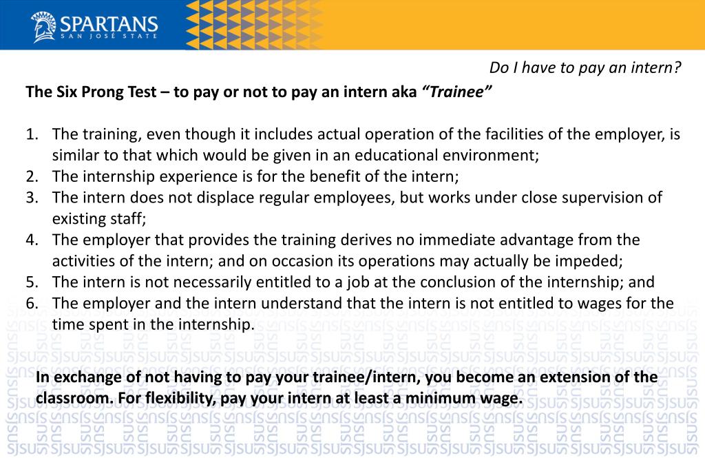 Do I have to pay an intern? The Six Prong Test – to pay or not to pay an intern aka “Trainee” The training, even though it includes actual operation of the facilities of the employer, is similar to that which would be given in an educational environment; The internship experience is for the benefit of the intern; The intern does not displace regular employees, but works under close supervision of existing staff; The employer that provides the training derives no immediate advantage from the activities of the intern; and on occasion its operations may actually be impeded; The intern is not necessarily entitled to a job at the conclusion of the internship; and The employer and the intern understand that the intern is not entitled to wages for the time spent in the internship. In exchange of not having to pay your trainee/intern, you become an extension of the classroom. For flexibility, pay your intern at least a minimum wage.