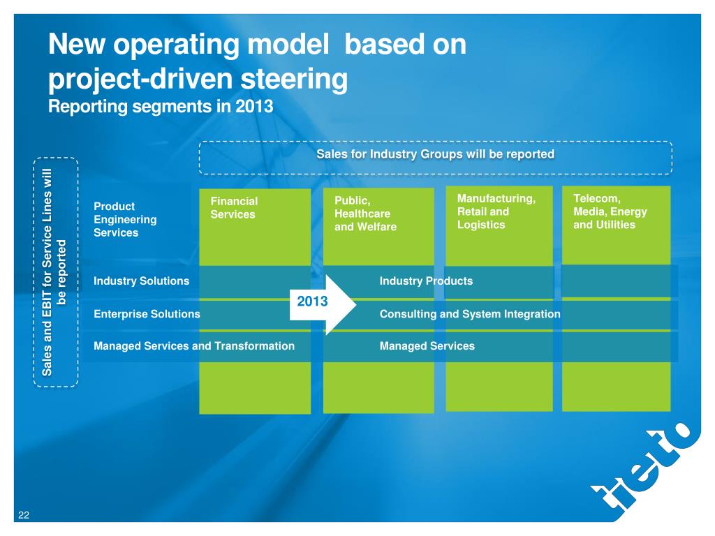 New operating model based onproject-driven steeringReporting segments in 2013 Sales for Industry Groups will be reported Product Engineering Services Manufacturing, Retail and Logistics Telecom, Media, Energy and Utilities Public, Healthcare and Welfare Financial Services Sales and EBIT for Service Lines will be reported Industry Solutions Industry Products 2013 Enterprise Solutions Consulting and System Integration Managed Services and TransformationManaged Services 22