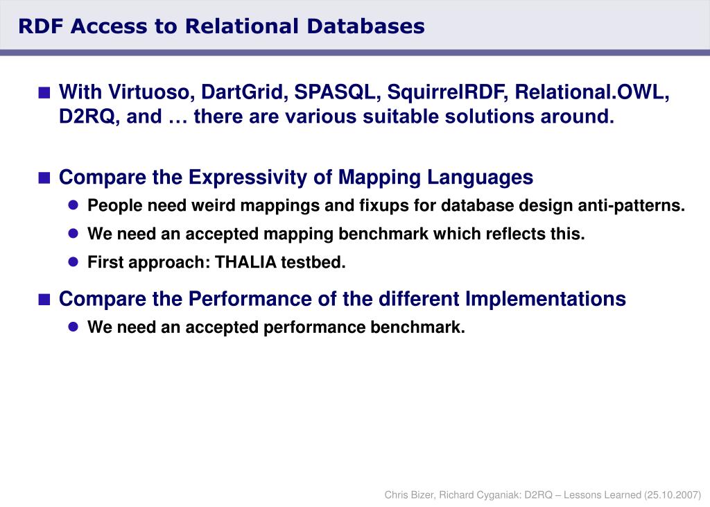 RDF Access to Relational Databases • With Virtuoso, DartGrid, SPASQL, SquirrelRDF, Relational.OWL, D2RQ, and … there are various suitable solutions around. • Compare the Expressivity of Mapping Languages • People need weird mappings and fixups for database design anti-patterns. • We need an accepted mapping benchmark which reflects this. • First approach: THALIA testbed. • Compare the Performance of the different Implementations • We need an accepted performance benchmark.