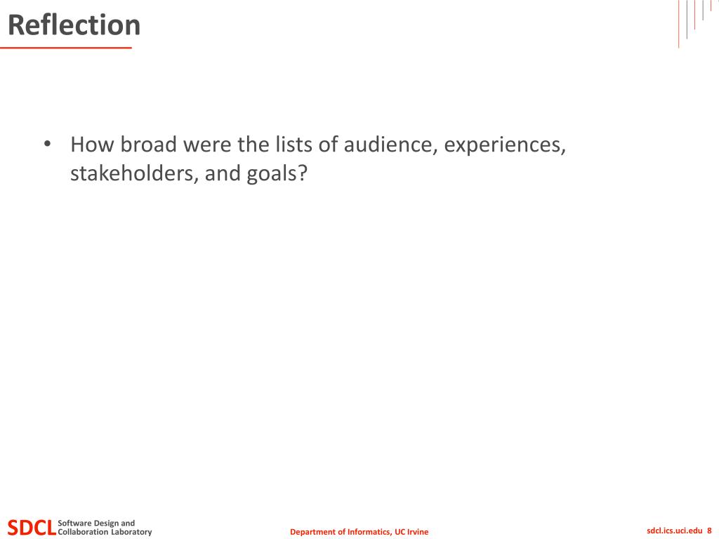 Reflection • How broad were the lists of audience, experiences, stakeholders, and goals?