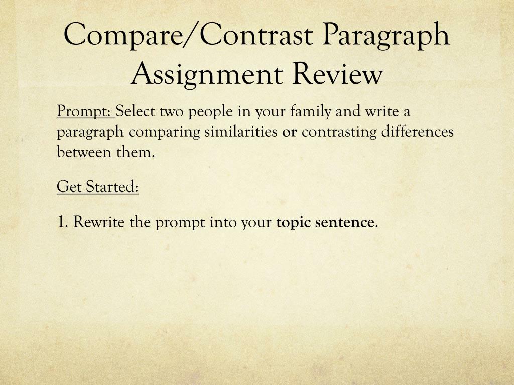 Compare/Contrast Paragraph Assignment Review Prompt: Select two people in your family and write a paragraph comparing similarities or contrasting differences between them. Get Started: • Rewrite the prompt into your topic sentence. • Write sentences with examples and details that support the main idea of your topic sentence.