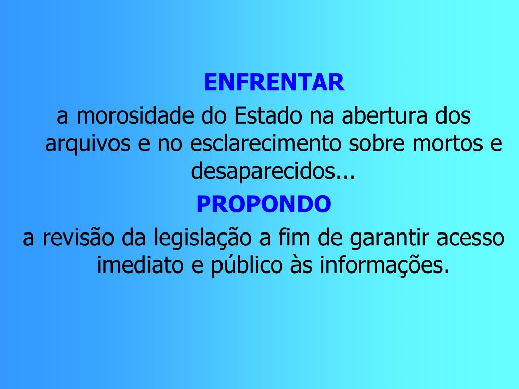 ENFRENTAR a morosidade do Estado na abertura dos arquivos e no esclarecimento sobre mortos e desaparecidos... PROPONDO a revisão da legislação a fim de garantir acesso imediato e público às informações.