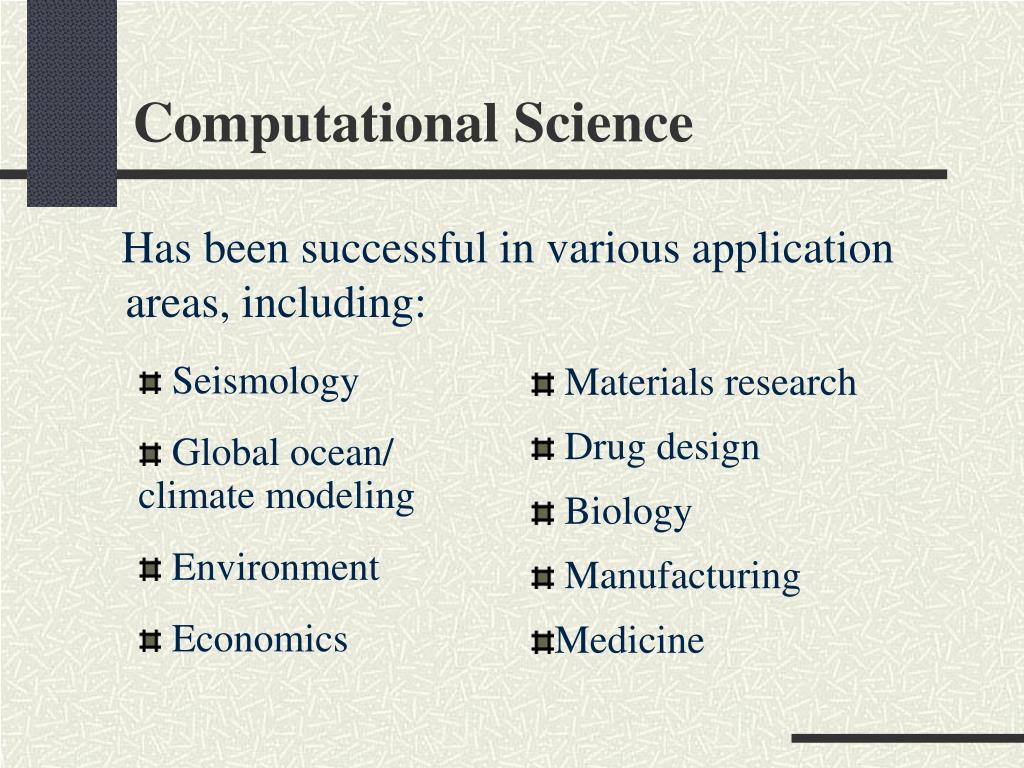 Computational Science Has been successful in various application areas, including: • Seismology • Global ocean/ climate modeling • Environment • Economics • Materials research • Drug design • Biology • Manufacturing • Medicine