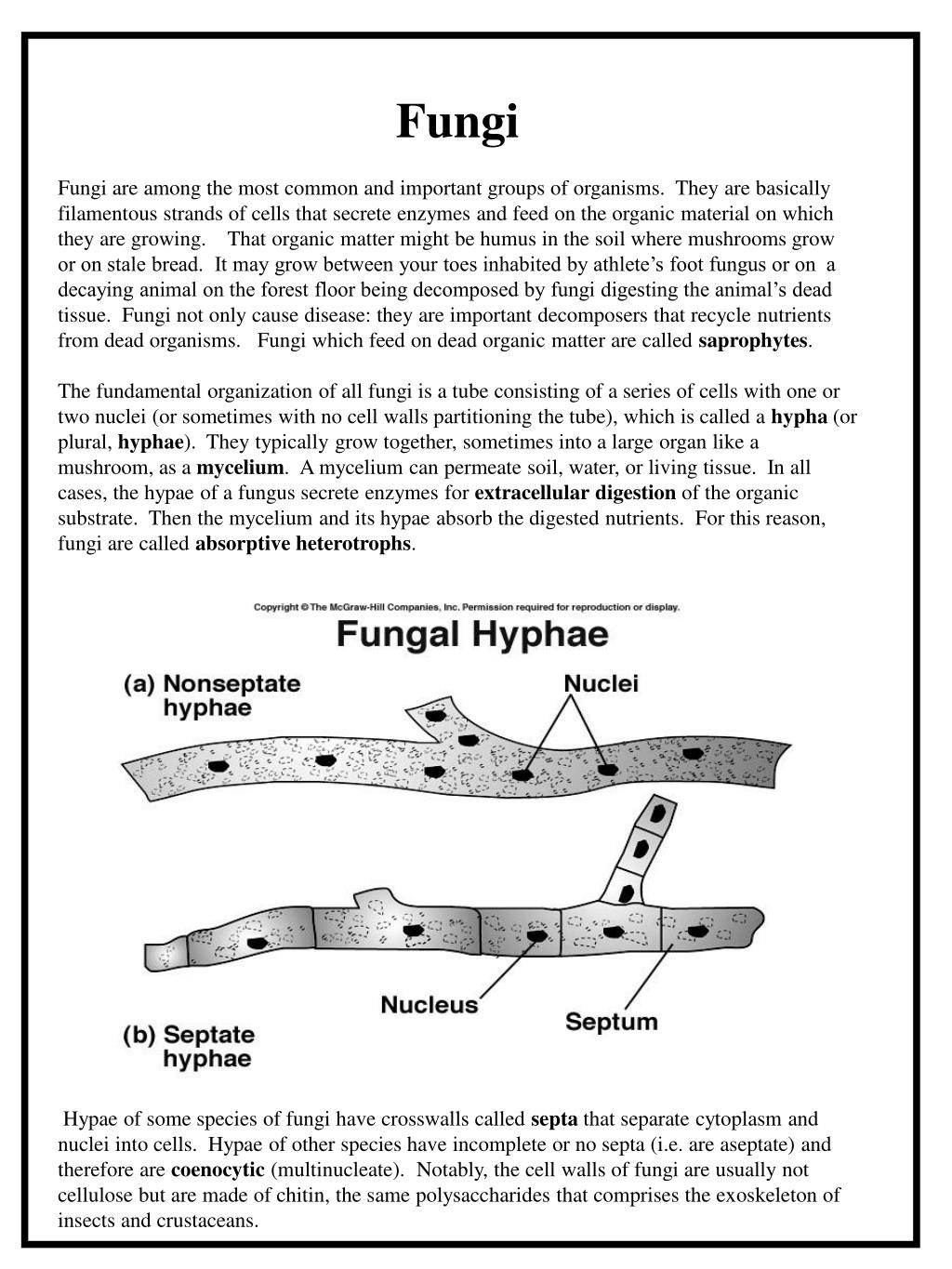 Fungi Fungi are among the most common and important groups of organisms. They are basically filamentous strands of cells that secrete enzymes and feed on the organic material on which they are growing. That organic matter might be humus in the soil where mushrooms grow or on stale bread. It may grow between your toes inhabited by athlete’s foot fungus or on a decaying animal on the forest floor being decomposed by fungi digesting the animal’s dead tissue. Fungi not only cause disease: they are important decomposers that recycle nutrients from dead organisms. Fungi which feed on dead organic matter are called saprophytes. The fundamental organization of all fungi is a tube consisting of a series of cells with one or two nuclei (or sometimes with no cell walls partitioning the tube), which is called a hypha (or plural, hyphae). They typically grow together, sometimes into a large organ like a mushroom, as a mycelium. A mycelium can permeate soil, water, or living tissue. In all cases, the hypae of a fungus secrete enzymes for extracellular digestion of the organic substrate. Then the mycelium and its hypae absorb the digested nutrients. For this reason, fungi are called absorptive heterotrophs. Hypae of some species of fungi have crosswalls called septa that separate cytoplasm and nuclei into cells. Hypae of other species have incomplete or no septa (i.e. are aseptate) and therefore are coenocytic (multinucleate). Notably, the cell walls of fungi are usually not cellulose but are made of chitin, the same polysaccharides that comprises the exoskeleton of insects and crustaceans.