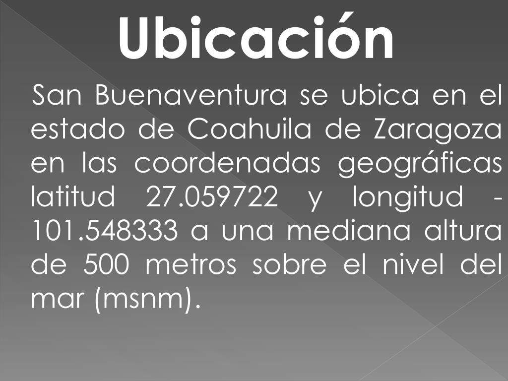 SAN BUENAVENTURA. Ubicación San Buenaventura se ubica en el estado de Coahuila de Zaragoza en las coordenadas geográficas latitud 27.059722 y longitud -101.548333 a una mediana altura de 500 metros sobre el nivel del mar (msnm). Población.