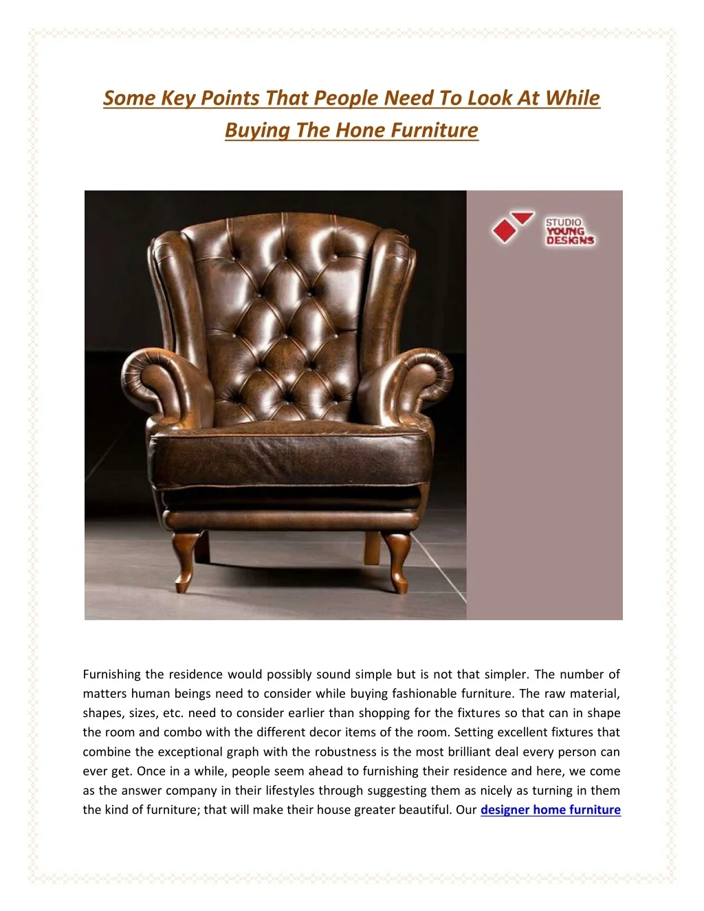 Some Key Points That People Need To Look At While Buying The Hone Furniture Furnishing the residence would possibly sound simple but is not that simpler. The number of matters human beings need to consider while buying fashionable furniture. The raw material, shapes, sizes, etc. need to consider earlier than shopping for the fixtures so that can in shape the room and combo with the different decor items of the room. Setting excellent fixtures that combine the exceptional graph with the robustness is the most brilliant deal every person can ever get. Once in a while, people seem ahead to furnishing their residence and here, we come as the answer company in their lifestyles through suggesting them as nicely as turning in them the kind of furniture; that will make their house greater beautiful. Our designer home furniture