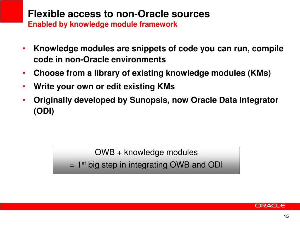 Flexible access to non-Oracle sources Enabled by knowledge module framework • Knowledge modules are snippets of code you can run, compile code in non-Oracle environments • Choose from a library of existing knowledge modules (KMs) • Write your own or edit existing KMs • Originally developed by Sunopsis, now Oracle Data Integrator (ODI) OWB + knowledge modules = 1st big step in integrating OWB and ODI