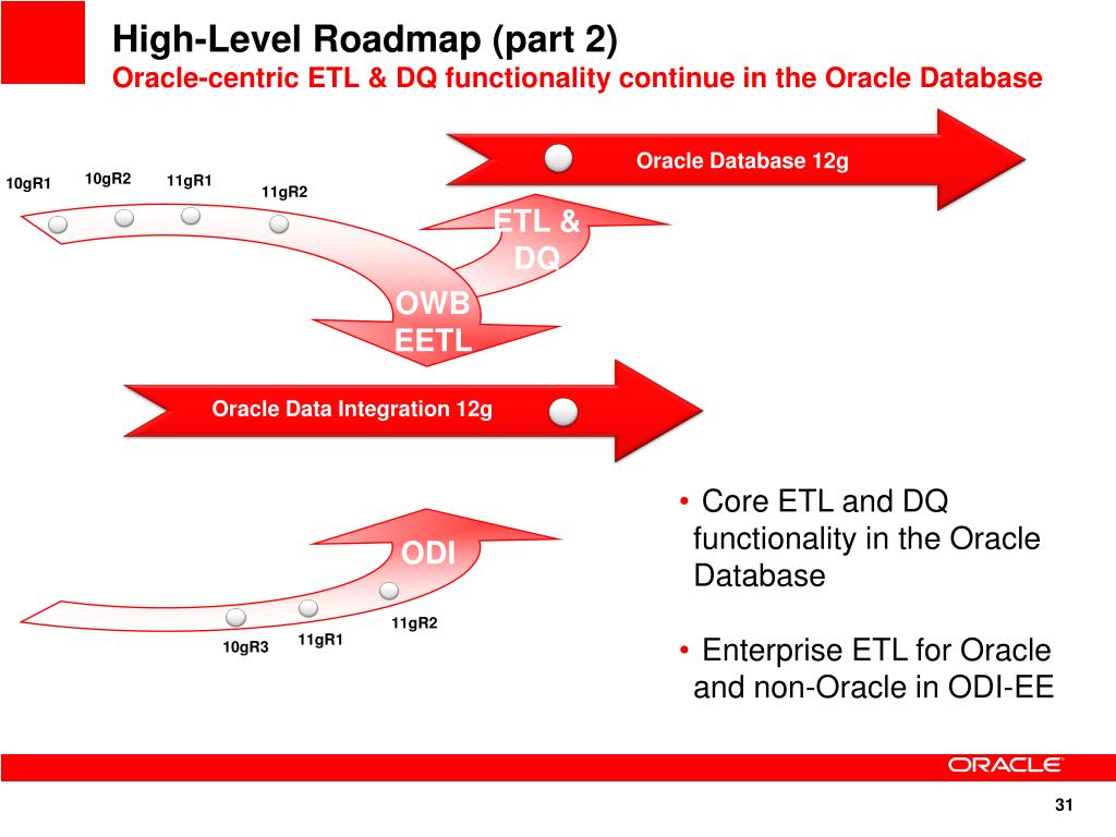 High-Level Roadmap (part 2)Oracle-centric ETL & DQ functionality continue in the Oracle Database Oracle Database 12g 10gR2 11gR1 10gR1 11gR2 ETL & DQ OWB EETL Oracle Data Integration 12g • Core ETL and DQ functionality in the Oracle Database • Enterprise ETL for Oracle and non-Oracle in ODI-EE ODI 11gR2 11gR1 10gR3