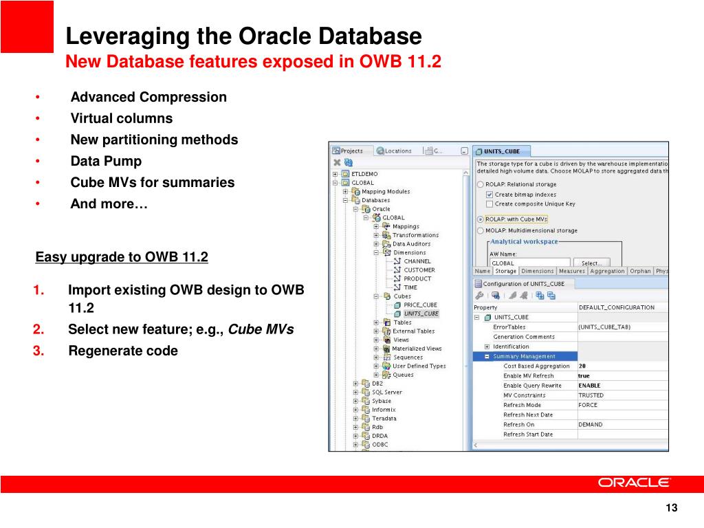 Leveraging the Oracle DatabaseNew Database features exposed in OWB 11.2 • Advanced Compression • Virtual columns • New partitioning methods • Data Pump • Cube MVs for summaries • And more… Easy upgrade to OWB 11.2 • Import existing OWB design to OWB 11.2 • Select new feature; e.g., Cube MVs • Regenerate code