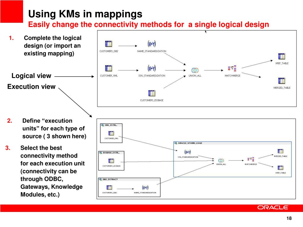 Using KMs in mappingsEasily change the connectivity methods for a single logical design • Complete the logical design (or import an existing mapping) Logical view Execution view • Define “execution units” for each type of source ( 3 shown here) • Select the best connectivity method for each execution unit (connectivity can be through ODBC, Gateways, Knowledge Modules, etc.)