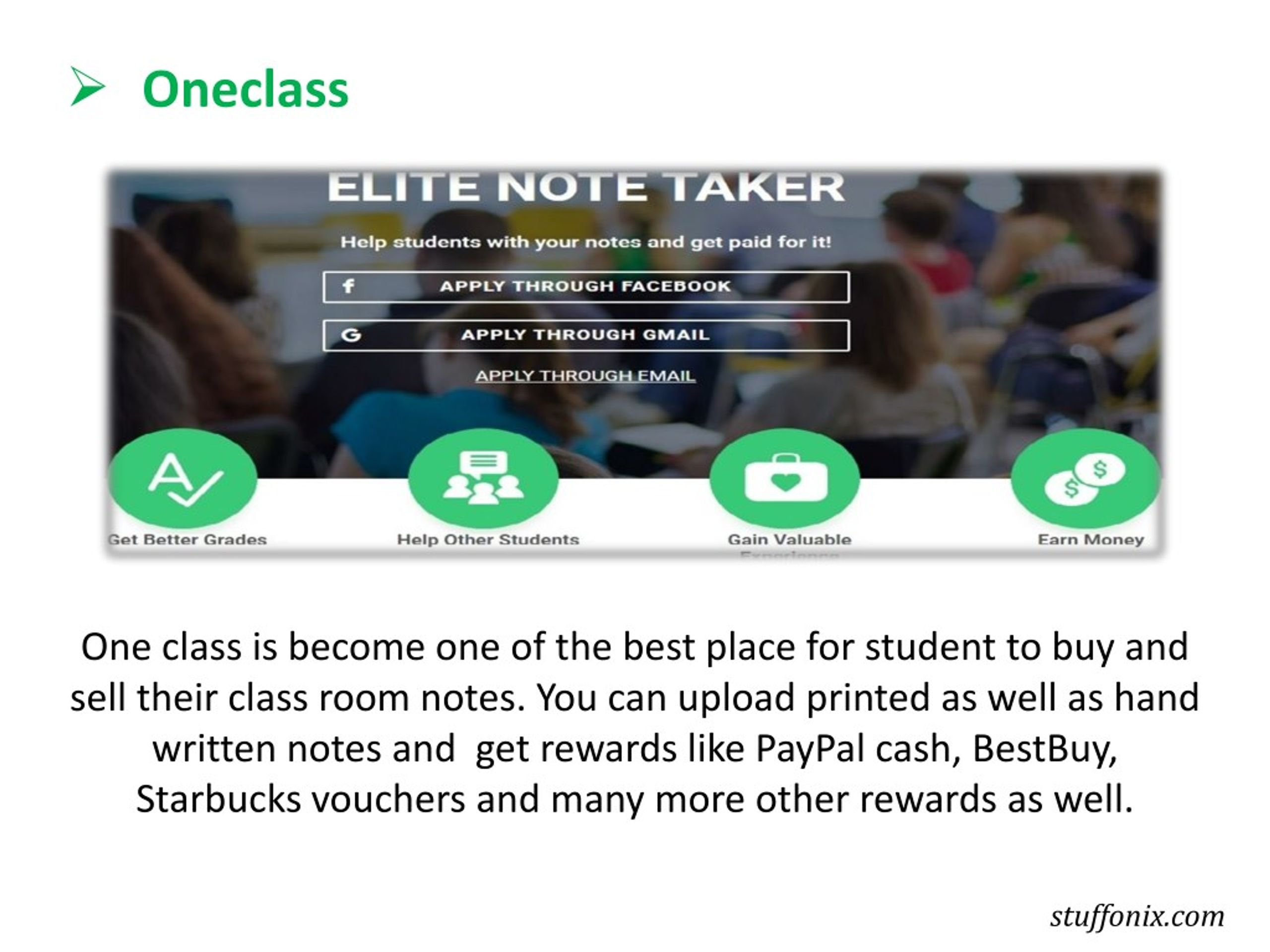 ➢ Oneclass One class is become one of the best place for student to buy and sell their class room notes. You can upload printed as well as hand written notes and get rewards like PayPal cash, BestBuy, Starbucks vouchers and many more other rewards as well. stuffonix.com