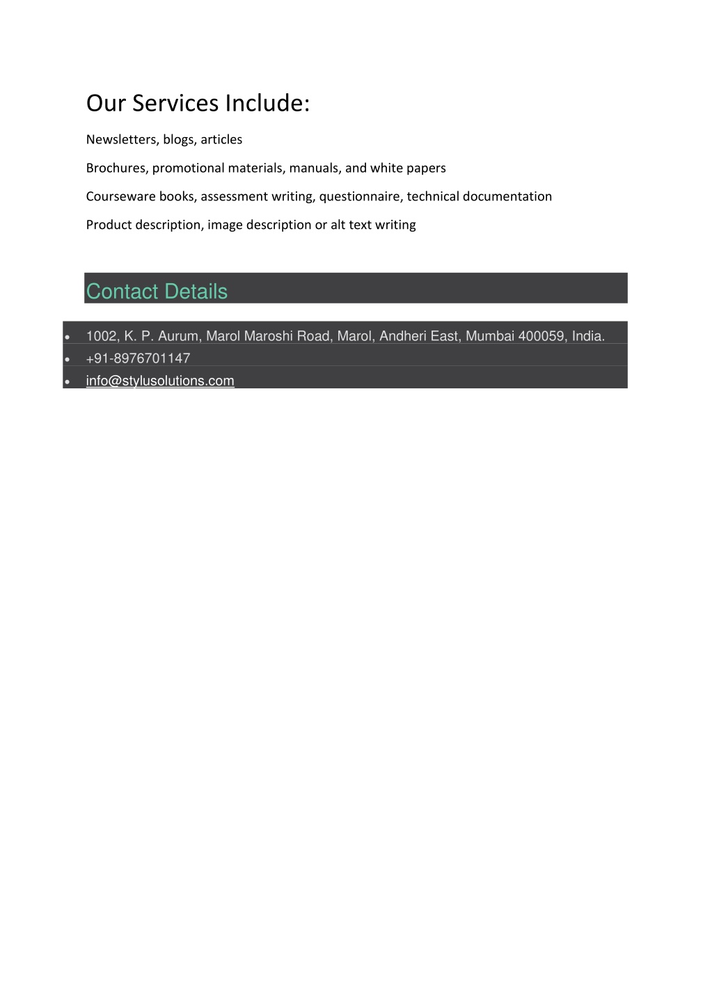 2. Our Services Include: Newsletters, blogs, articles Brochures, promotional materials, manuals, and white papers Courseware books, assessment writing, questionnaire, technical documentation Product description, image description or alt text writing Contact Details 1002, K. P. Aurum, Marol Maroshi Road, Marol, Andheri East, Mumbai 400059, India. +91-8976701147 info@stylusolutions.com   