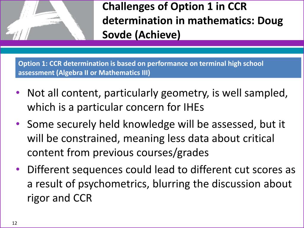 Challenges of Option 1 in CCR determination in mathematics: Doug Sovde (Achieve) • Not all content, particularly geometry, is well sampled, which is a particular concern for IHEs • Some securely held knowledge will be assessed, but it will be constrained, meaning less data about critical content from previous courses/grades • Different sequences could lead to different cut scores as a result of psychometrics, blurring the discussion about rigor and CCR