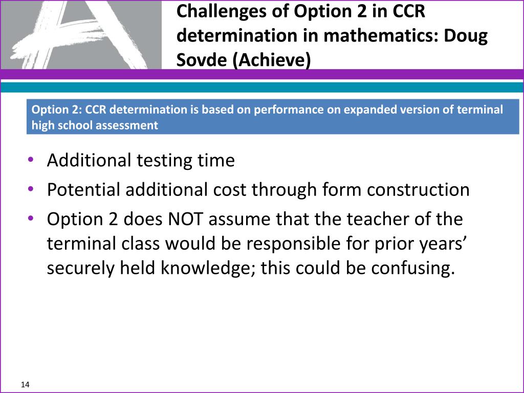Challenges of Option 2 in CCR determination in mathematics: Doug Sovde (Achieve) • Additional testing time • Potential additional cost through form construction • Option 2 does NOT assume that the teacher of the terminal class would be responsible for prior years’ securely held knowledge; this could be confusing.