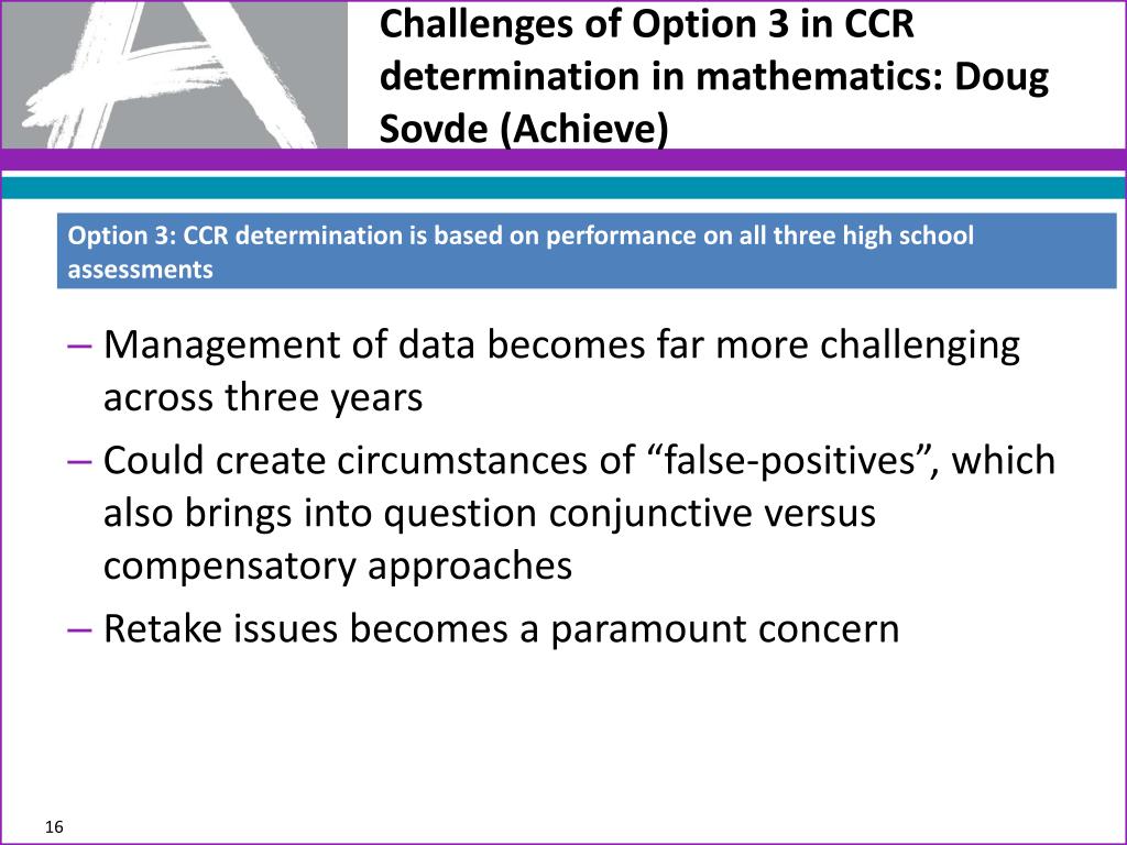 Challenges of Option 3 in CCR determination in mathematics: Doug Sovde (Achieve) • Management of data becomes far more challenging across three years • Could create circumstances of “false-positives”, which also brings into question conjunctive versus compensatory approaches • Retake issues becomes a paramount concern