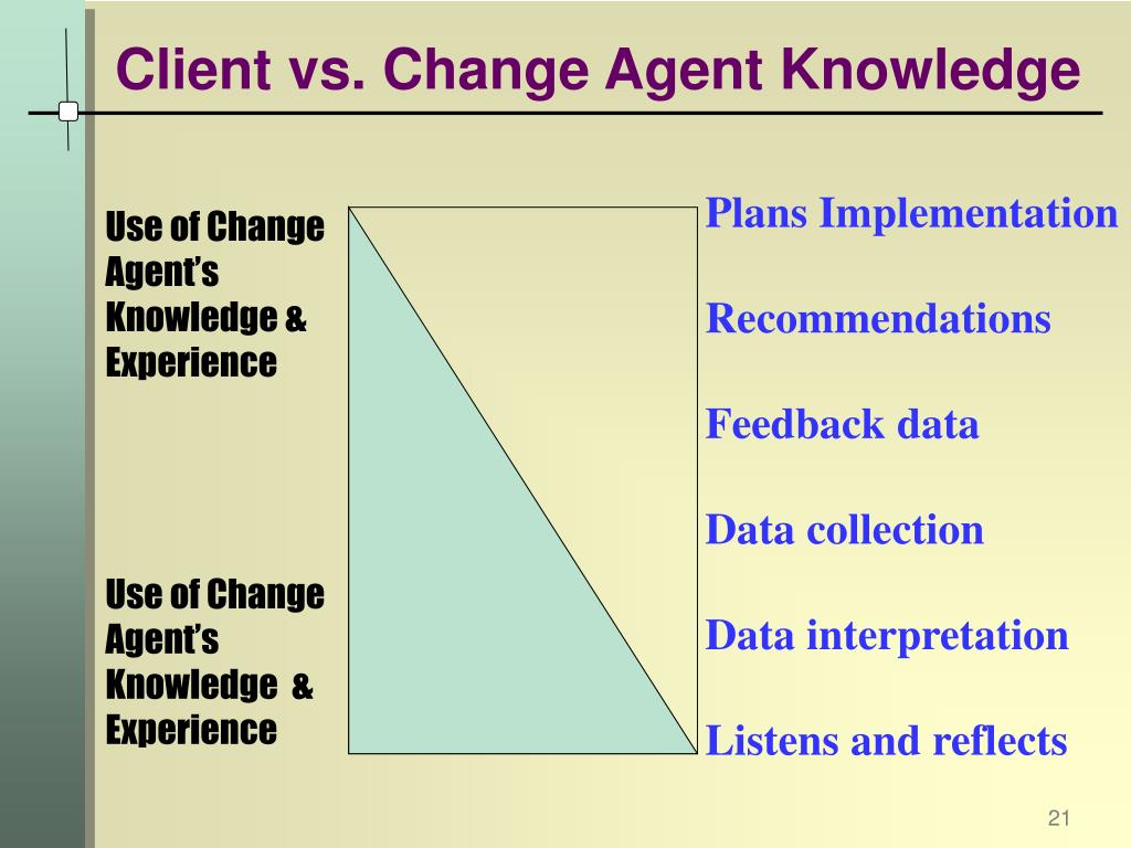 Client vs. Change Agent Knowledge Plans Implementation Recommendations Feedback data Data collection Data interpretation Listens and reflects Use of Change Agent’s Knowledge & Experience Use of Change Agent’s Knowledge & Experience