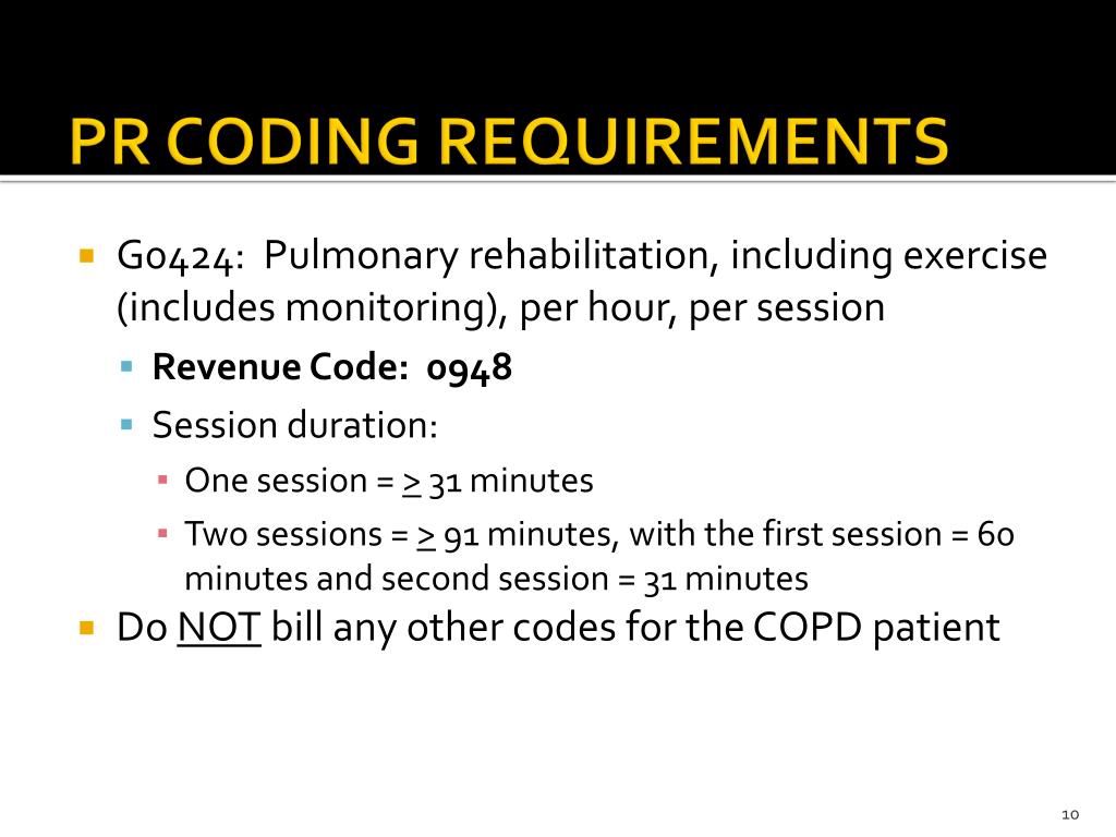 PR CODING REQUIREMENTS • G0424: Pulmonary rehabilitation, including exercise (includes monitoring), per hour, per session • Revenue Code: 0948 • Session duration: • One session = > 31 minutes • Two sessions = > 91 minutes, with the first session = 60 minutes and second session = 31 minutes • Do NOT bill any other codes for the COPD patient