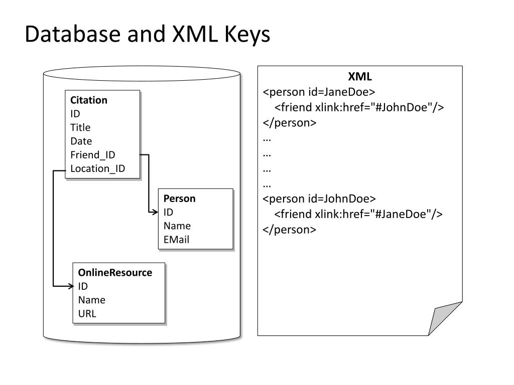 Database and XML Keys XML <person id=JaneDoe> <friend xlink:href="#JohnDoe"/> </person> Citation ID Title Date Friend_ID Location_ID Person ID Name EMail … … … … <person id=JohnDoe> <friend xlink:href="#JaneDoe"/> </person> OnlineResource ID Name URL