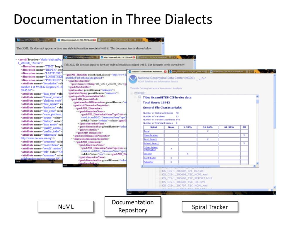 Documentation in Three Dialects Documentation Repository NcML Spiral Tracker