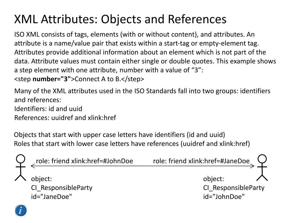 XML Attributes: Objects and References ISO XML consists of tags, elements (with or without content), and attributes. An attribute is a name/value pair that exists within a start-tag or empty-element tag. Attributes provide additional information about an element which is not part of the data. Attribute values must contain either single or double quotes. This example shows a step element with one attribute, number with a value of “3”: <step number="3">Connect A to B.</step> Many of the XML attributes used in the ISO Standards fall into two groups: identifiers and references: Identifiers: id and uuid References: uuidref and xlink:href Objects that start with upper case letters have identifiers (id and uuid) Roles that start with lower case letters have references (uuidref and xlink:href) role: friend xlink:href=#JohnDoe role: friend xlink:href=#JaneDoe object: CI_ResponsibleParty id="JaneDoe" object: CI_ResponsibleParty id="JohnDoe"