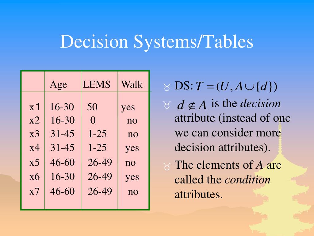 DS: is the decision attribute(instead of one we can consider more decision attributes). The elements of A are called the condition attributes. Decision Systems/Tables Age LEMS Walk x1 16-30 50 yes x2 16-30 0 no x3 31-45 1-25 no x4 31-45 1-25 yes x5 46-60 26-49 no x6 16-30 26-49 yes x7 46-60 26-49 no