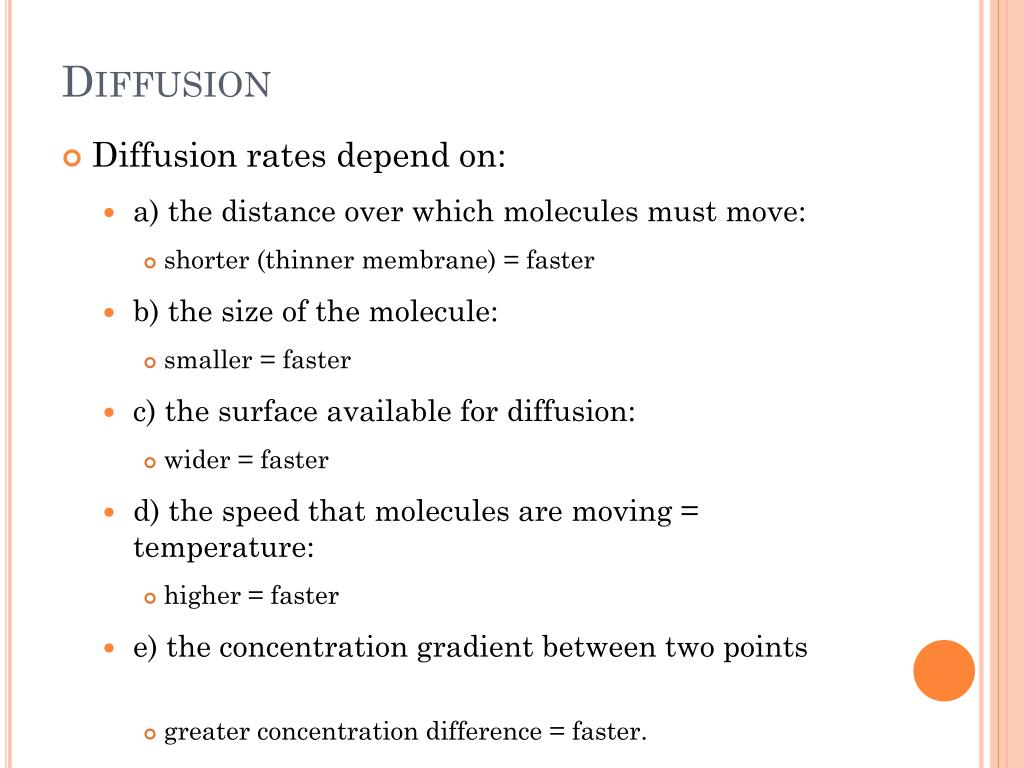 Diffusion • Diffusion rates depend on: • a) the distance over which molecules must move: • shorter (thinner membrane) = faster • b) the size of the molecule: • smaller = faster • c) the surface available for diffusion: • wider = faster • d) the speed that molecules are moving = temperature: • higher = faster • e) the concentration gradient between two points • greater concentration difference = faster.