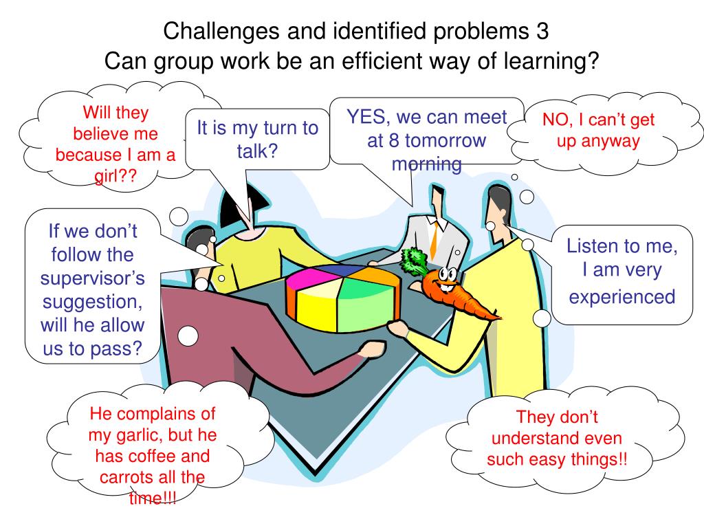 Challenges and identified problems 3Can group work be an efficient way of learning? Will they believe me because I am a girl?? NO, I can’t get up anyway YES, we can meet at 8 tomorrow morning It is my turn to talk? If we don’t follow the supervisor’s suggestion, will he allow us to pass? Listen to me, I am very experienced He complains of my garlic, but he has coffee and carrots all the time!!! They don’t understand even such easy things!!